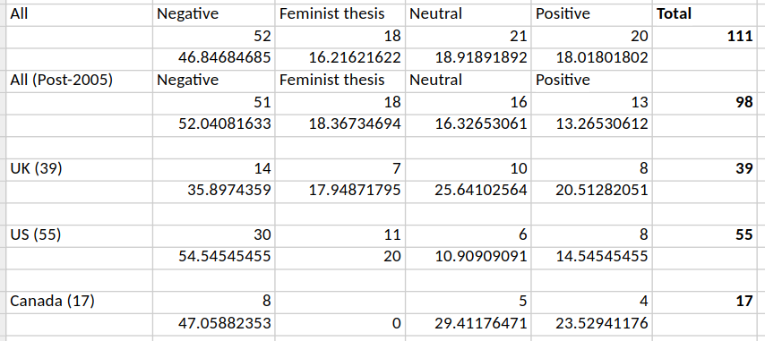 Identified articles were screened and categorized as ‘positive’, ‘negative’, ‘feminist thesis’ or ‘neutral’ by one reviewer (OE).