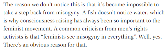 After cutting out a completely unnecessary ad photo for an unrelated article, we are stuck with assumptions about the headlines from an article linked in from The New Statesman (Whose site looks like a big print kid’s book,) along with more showing of a lack of comprehension of what a tabloid looks like (Can’t look in the mirror). And MORE accusations of liking the hard wood of mahogany, oh wait – talking about ‘misogyny’….right. But there is more of feminism’s blatant dehumanization of men by depicting them as dens of hatred, and its dehumanization of women by denying agency, responsibility, along with denying the sexual nature of the entire species through the same puritanical bullshit that the evangelicals preached in the late 80’s and early 90’s. In short, I fear for this woman’s children and her mental state because at this point its all but bye bye.